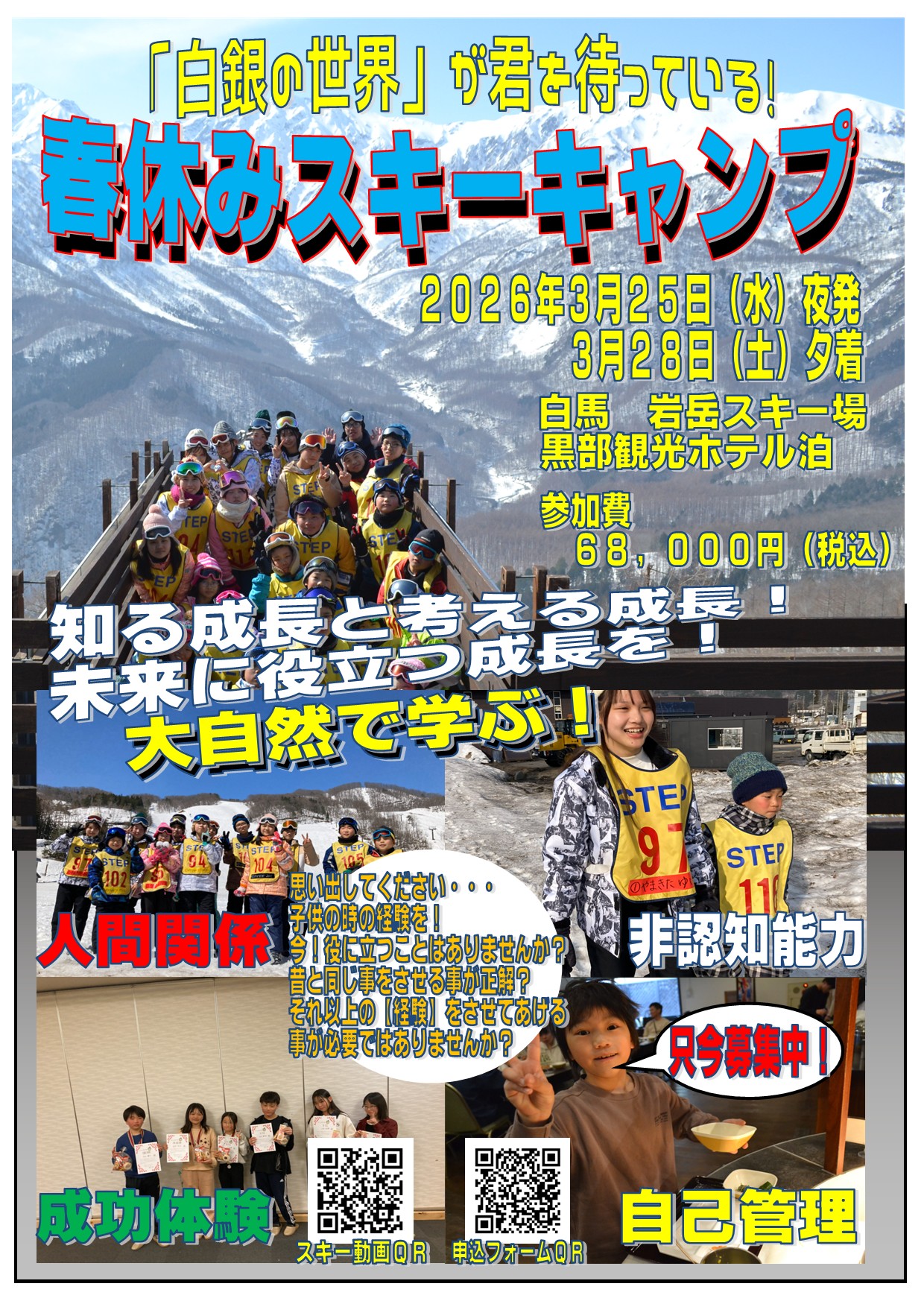 news 春休みスキーキャンプ 2026年1月13日 雪がいっぱい!友達いっぱい! 白銀の世界が君を待っている! 今、沢山の経験をすることは、必ず大人になってから役に立つ! 子供のうちにいっぱい色々な体験をしておこう! お申込みは下記URLから行ってください! https://scr.buscatch.net/application/?f=s-patio&i=115344 詳しくはコチラをクリック news